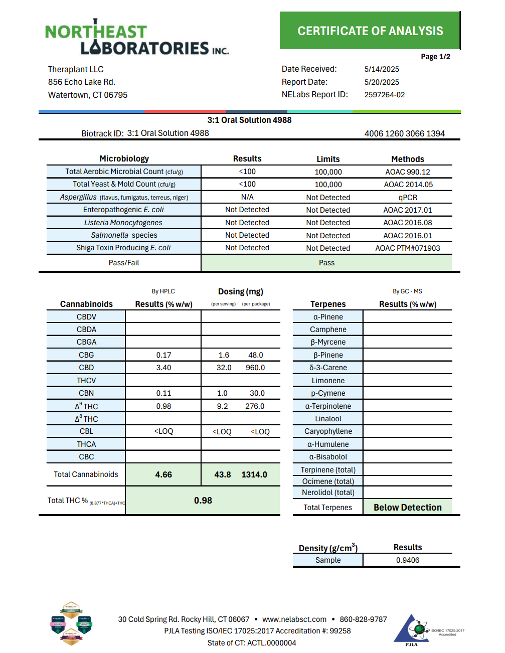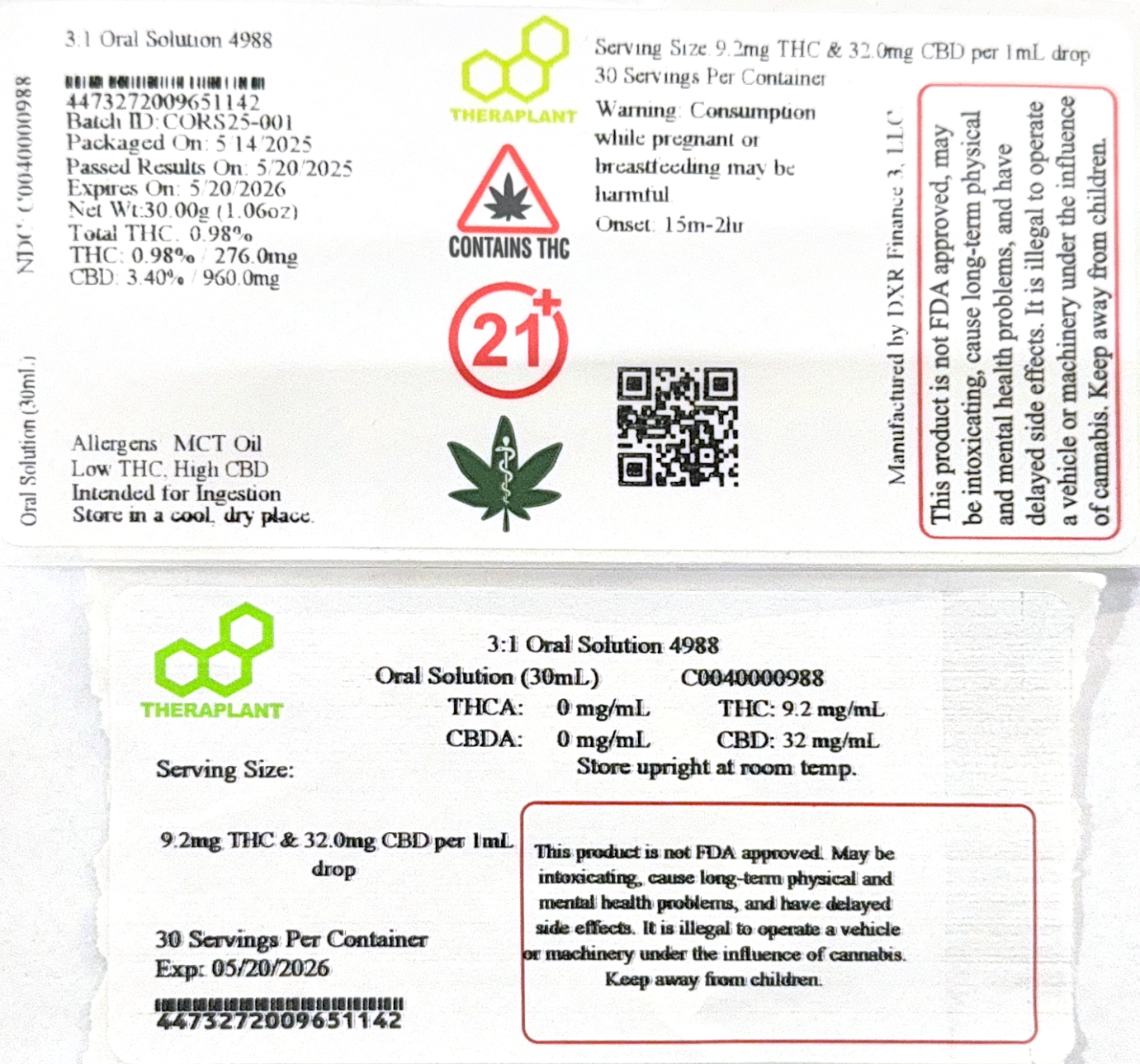 Medical- 3:1 Oral Solution 4988- 9.2mg THC/32mg CBD per 1mL Drop