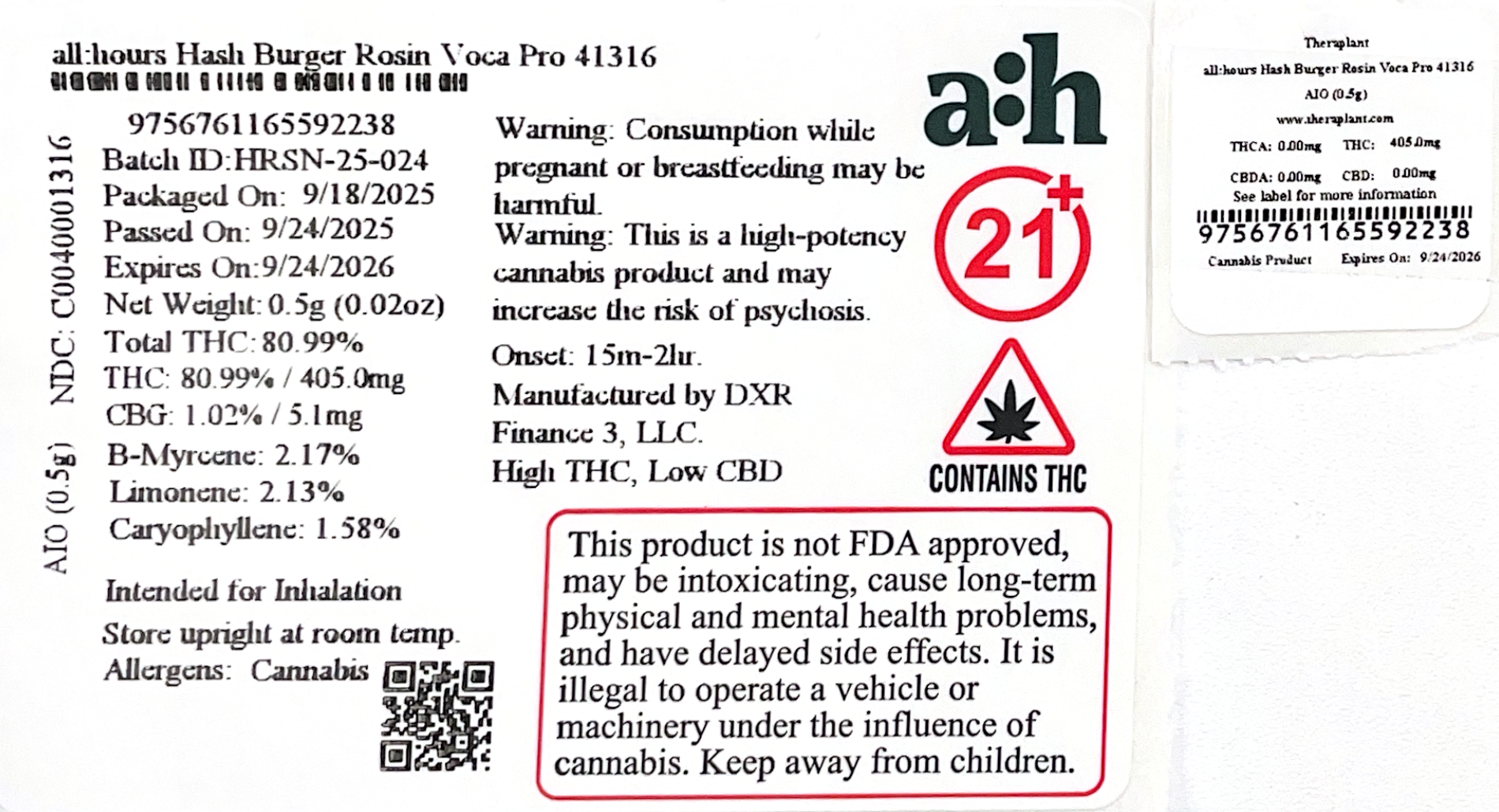 all:hours Hash Burger Rosin Voca Pro 41316- 80.99% THC