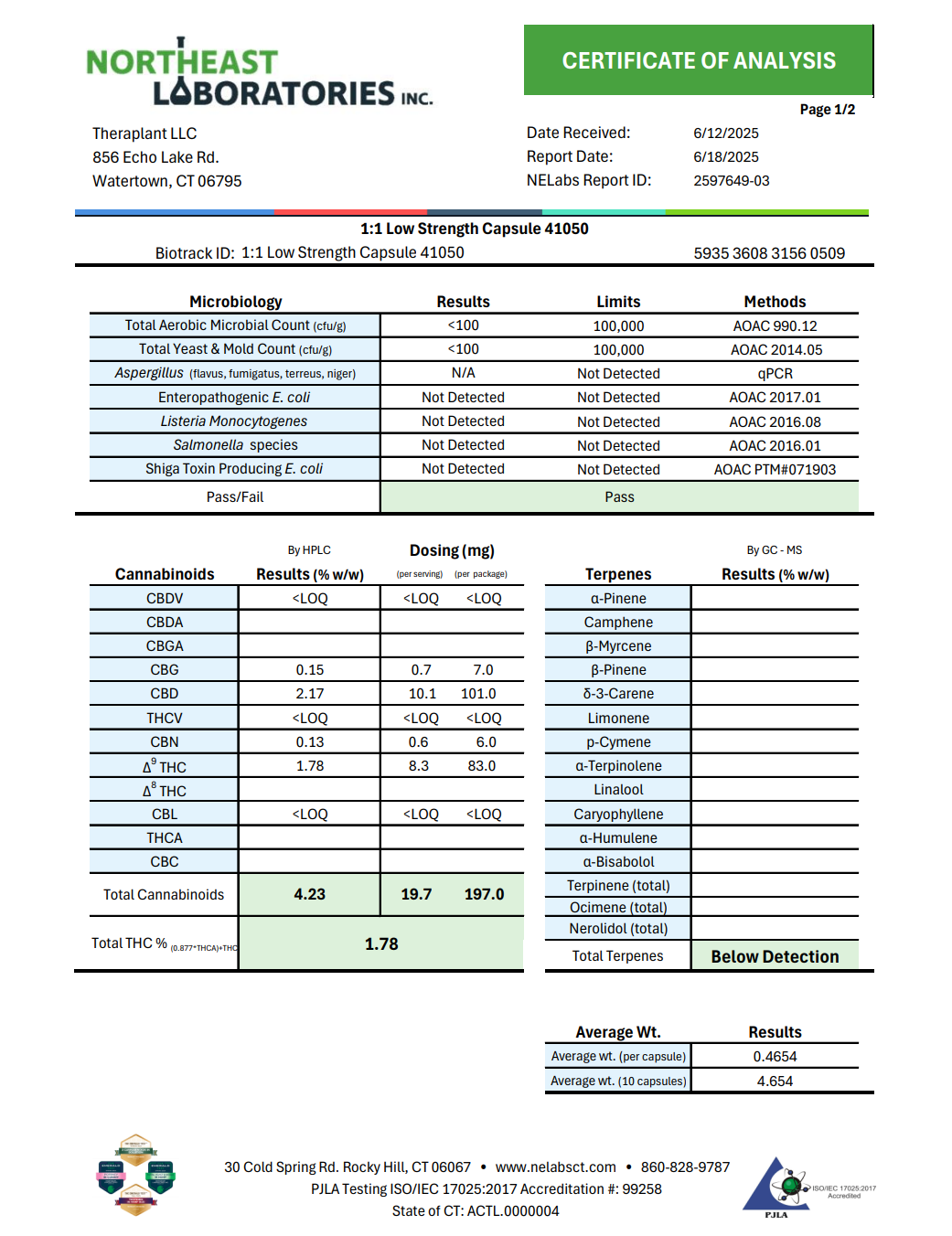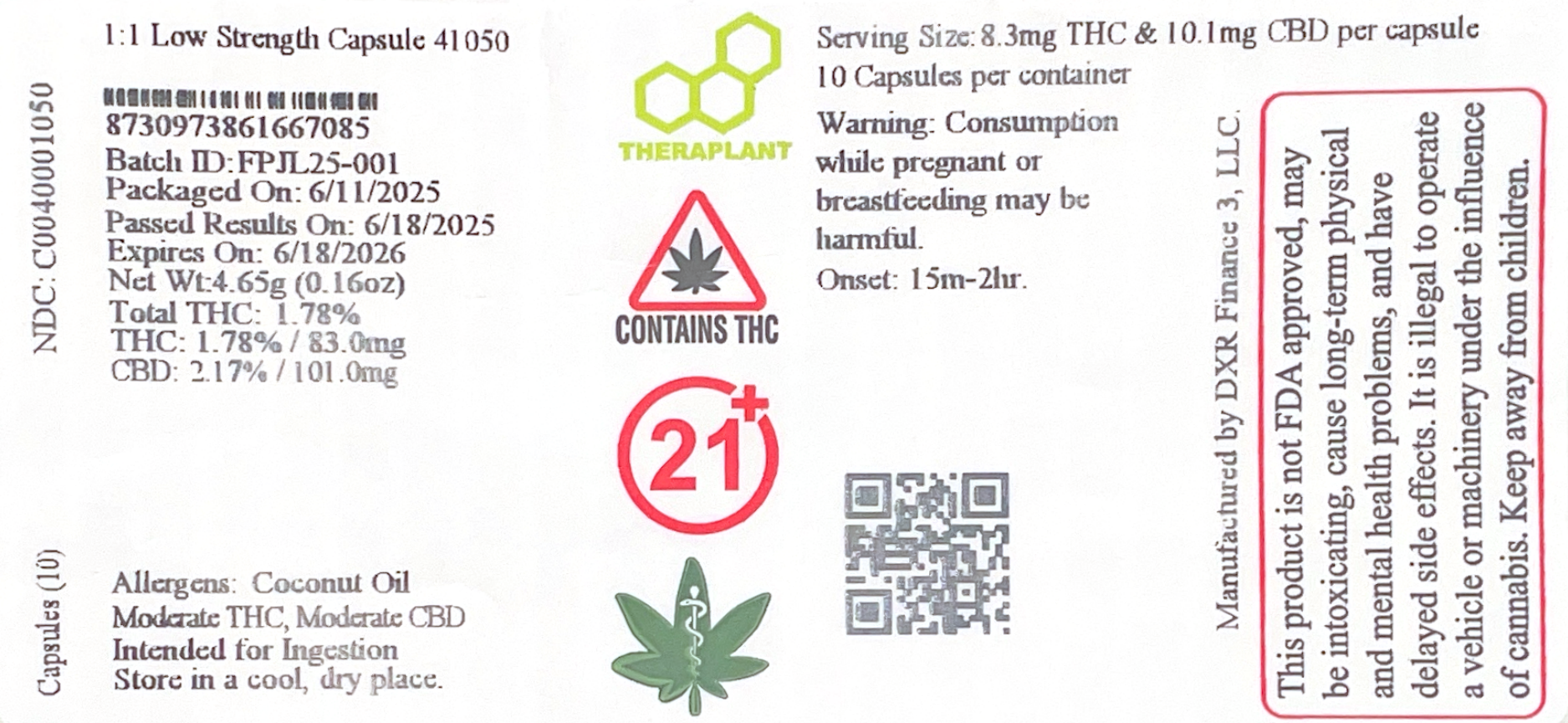 8.3mg THC/ 10.1mg CBD per capsule- 83mg THC /101mg CBD per bottle